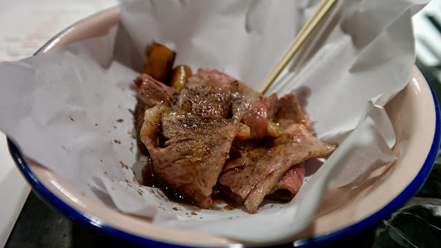 After the abalone, Alvin left us to mix with the other guests and overlook his kitchen, which left one of his head chefs to explain the next course of Saga-Gyu. Paying homage to the street food of Hong Kong, the incredibly tender meat was accompanied by some truffle infused Chinese pasta rolls and was eaten street food style with a wooden skewer. It. Was. Delicious! Seriously great food, with such simple cooking there is no place to hide and the Saga-Gyu left me wanting more. Luckily, SC was pretty full, so I was able to snatch the last little bit of her meat!