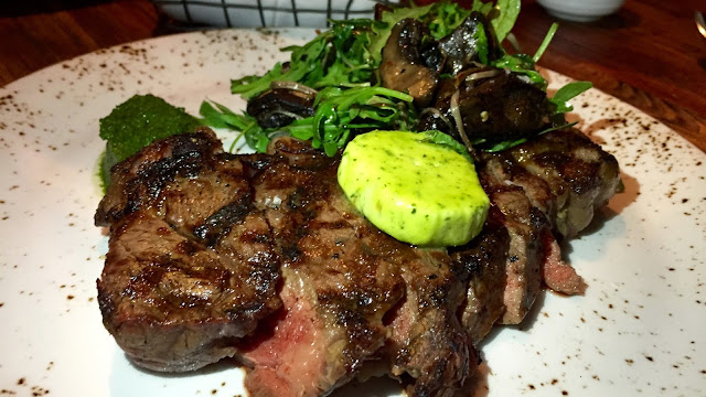 WH and I ordered the exact same main, the US 350g Black Angus 400 day aged rib eye served with roasted wild mushrooms and basil topped with a knob of herb butter. We'd even ordered them both medium rare. Our steaks were delivered and looked the goods, each was sliced showing that the expertly cooked beef was indeed a perfect medium rare. I really quite liked the beef, which had a nice flavour, but I found my cut to be especially fatty and the medium rare cook had not quite rendered the fat to a point where it was soft enough to eat. It felt like I was wasting so much of the meat by cutting round the fat. I also didn't particularly like the roasted wild mushrooms, which possibly needed a little more seasoning while cooking.