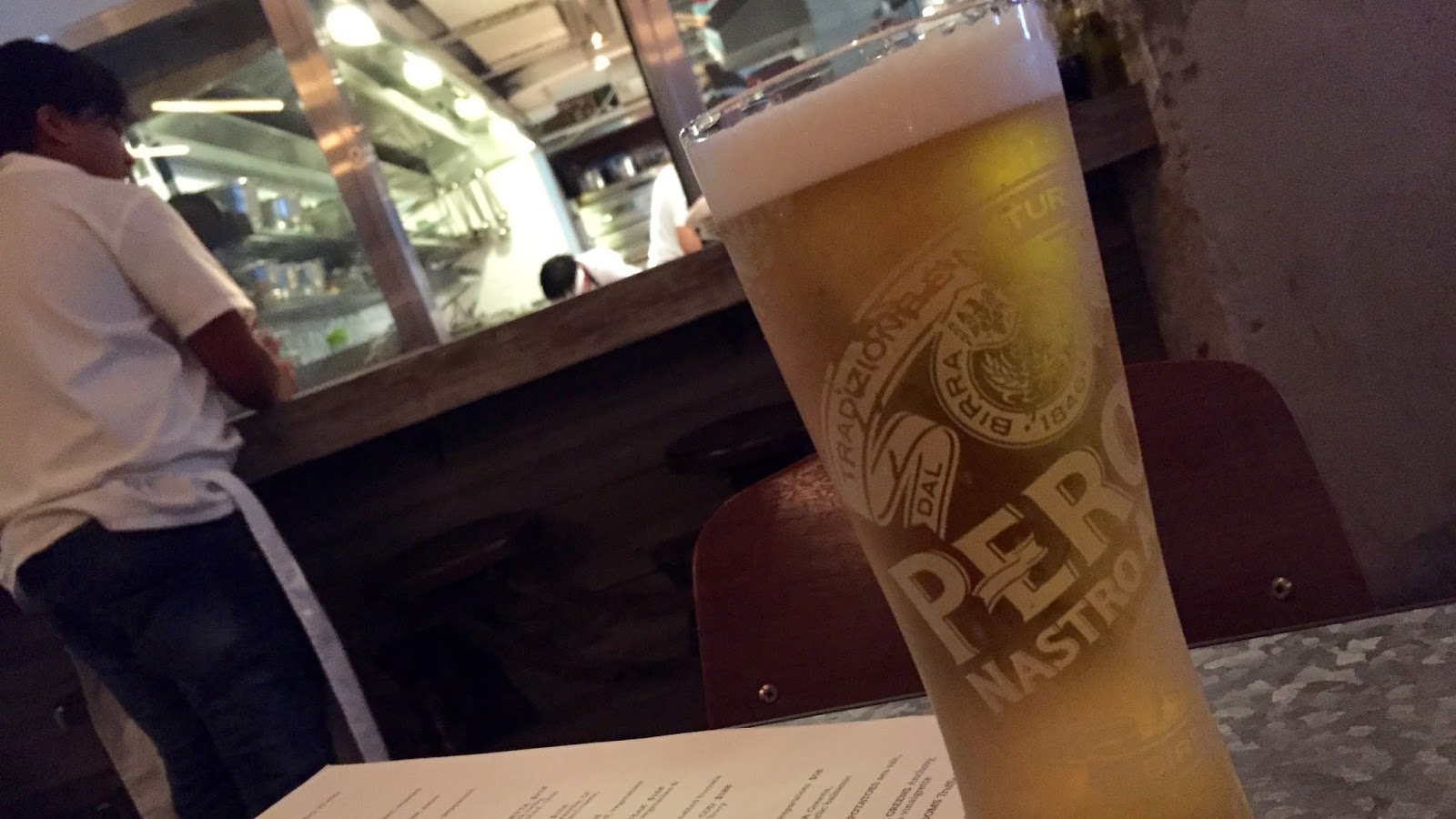 If you've walked up the escalators through Soho, then you'd have seen Linguini Fini before, it's pretty hard to miss. What makes it stand out so much is its open facade and its bright red neon sign, shining like a beacon calling in weary travellers for a beer and a pizza. We were led around the back of the restaurant and given a seat that had a prime view of the kitchen, which gave me a bit of a sense of Linguini Fini. Know for it's fresh produce that's locally sourced, I could see fresh pasta hanging from the ceiling and one of the chefs handling a huge fish that looked like it was squirming about, it was so fresh.